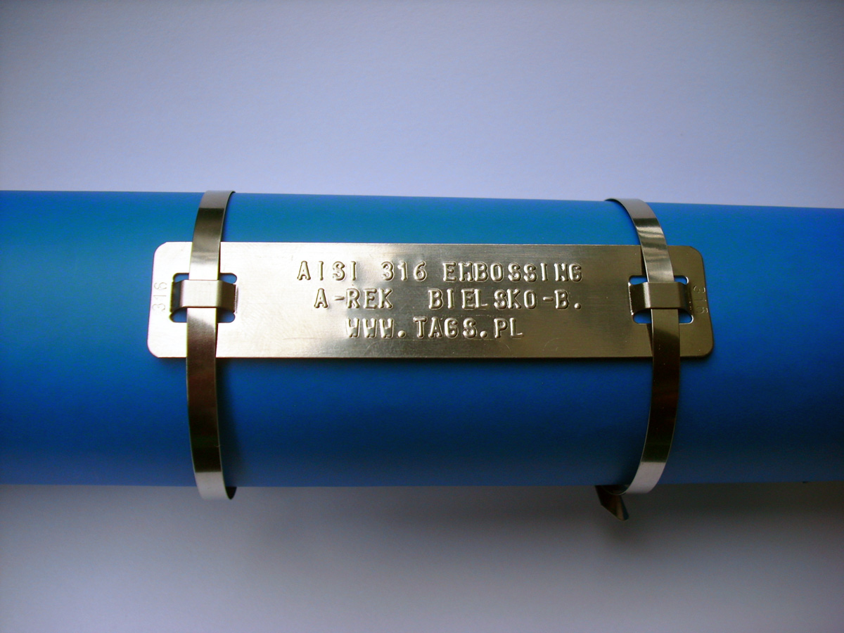 Oznaczniki kablowe ze stali kwasoodpornej do opisu instalacji i rurociÄ…gów. Pismo wypukÅ‚e (embossing) zapewnia czytelność w najtrudniejszych warunkach zapylenia, zabrudzenia i pokrycia lakierem. Mocowanie opaskami zaciskowymi nierdzewnymi.